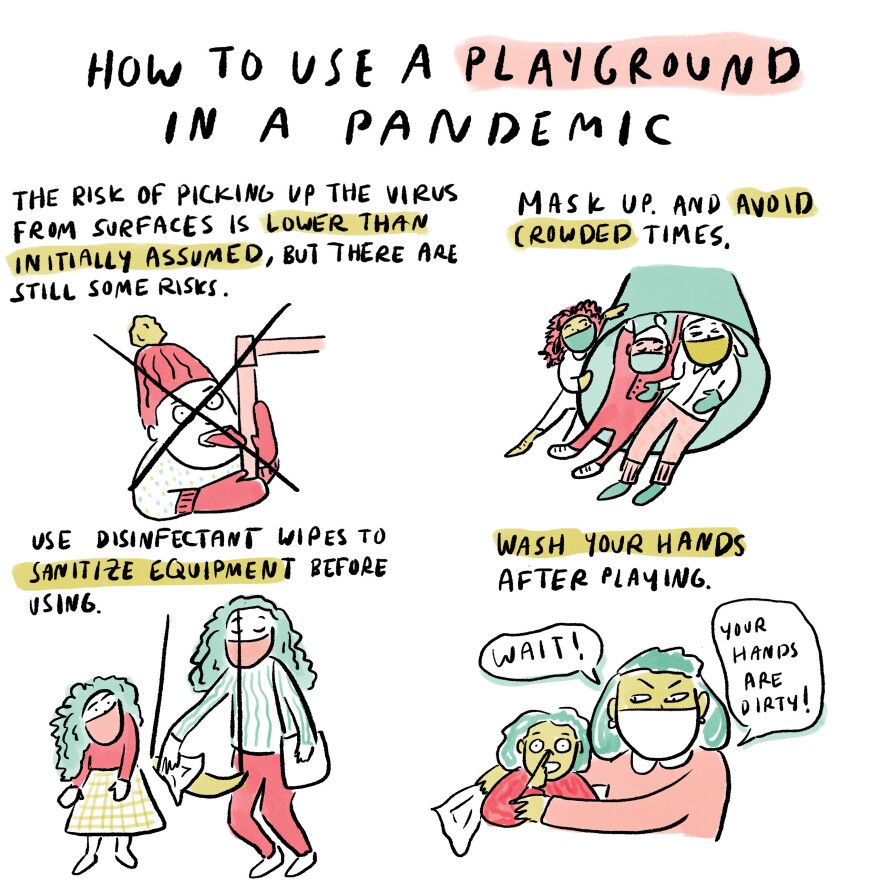 Well, Karan explains, since fomites, epidemiologically, are not a huge source of viral transfer, it's probably not likely that children will pick up the virus and later infect themselves while careening down a slide or monkeying around on the monkey bars. The bigger risk is respiratory transmission— so it's critical you follow some of the general guidelines: masking, sanitizing hands after visiting, and physical distancing while on the scene.