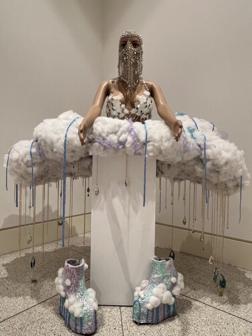 One features a model wearing a silver chainmail and crystal facial covering, her neon green hair slicked back. She is outfitted in a white bodysuit, atop the bodice white cloud-shaped pendants are chained together with silver O-rings, and at the hips, fluffy white clouds of cotton billow in each direction. Cascading underneath the clouds hang decorative chains and crystals that simulate rainfall.