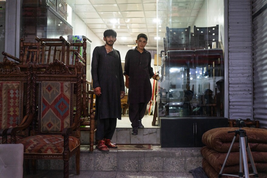 At this used furniture store, Wahid Kashafi (left) and Abdul Kahar give a snapshot of life in the capital. Few people have money to buy furniture, but many are selling — as they prepare to leave the country, or to buy food.