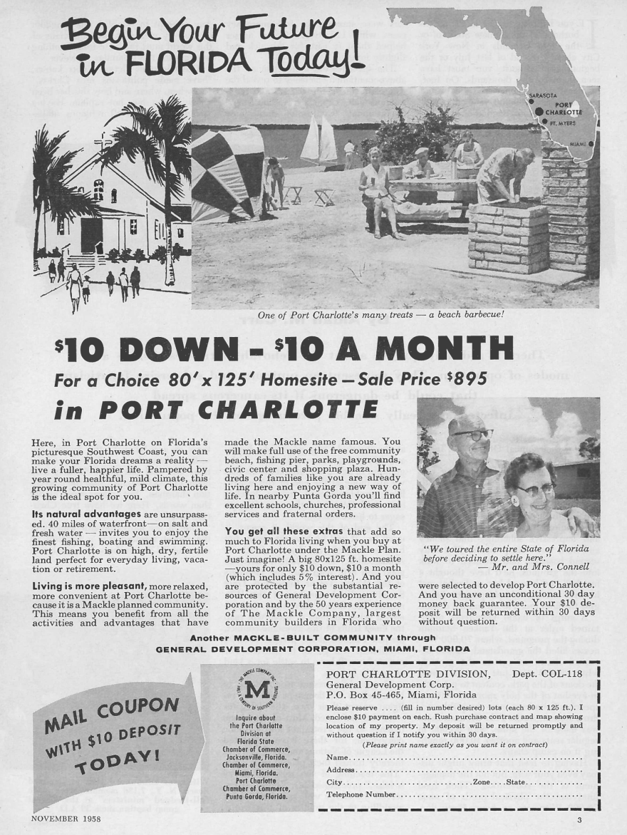 From the mid-1950s through the mid-1970s there was a land boom in Florida driven by what were known as Installment Land Sales, which offered lots in Florida for as little as $10 down and $10 a month. These Installment Land Sale schemes laid the foundations for cities like Cape Coral, Port Charlotte, Lehigh Acres, Golden Gate, Marco Island, and Port St. Lucie.
